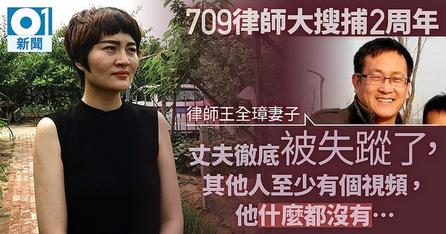 兩年前的7月9日,數百位內地維權律師被補,其中一名律師王全璋兩年來音訊全無,連一段官方發放的影片亦沒有,其妻李文足在北京接受《香港01》專訪時直言,丈夫是「徹底被失蹤」,擔心因酷刑而致殘。