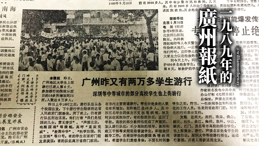 前兩年在廣東省內的一個市級圖書館,特意翻看1989年的《南方日報》和《廣州日報》,就想看看當時廣州本地傳媒,是如何記載這段歷史的。剪報一直在電腦中存檔,粗略所只是看到大學生遊行、佔領海珠橋的相片,以及部份本地報道,未有時間系統地整理。