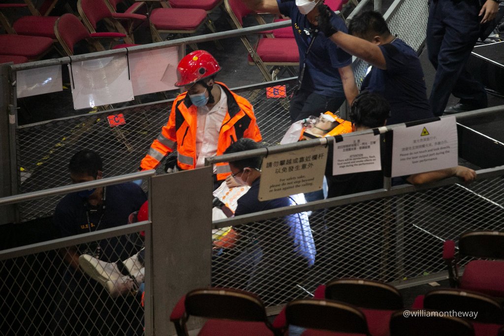 During a concert by Hong Kong’s singing boy group MIRROR at the Hong Kong Coliseum on July 28, 2022, a large overhead video screen fell onto the stage, seriously injuring two dancers. One of them, Li Kai-yin Moses, is at risk of being paralyzed. This photo captures the moment the screen fell and crushed one of the dancers. Other people were helping to remove the screen while two members of MIRROR, Anson Lo and Edan Lui, looked shocked. (Photo: William Lo)
