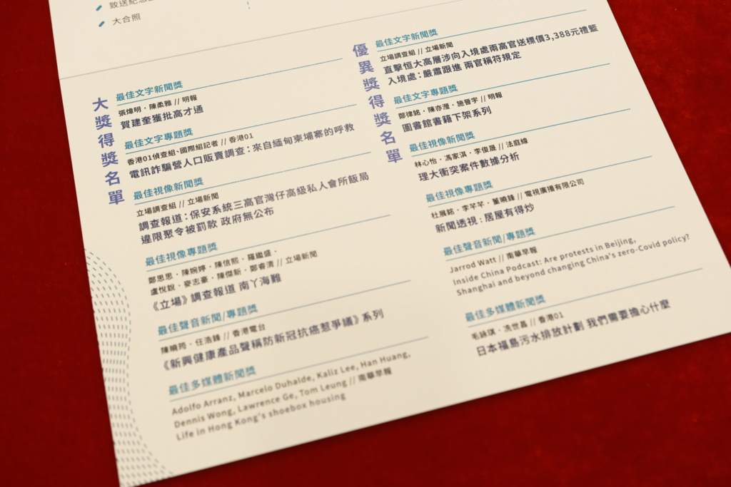 《立場》三篇重要的報道獲獎,相識多年的立場美術組大腦劉仁顯說,「立場美術係應該有這一日,有一個獎」,他又指分享感言「兩分鐘不夠」,「敢言係成世嘅,勇敢個敢。」